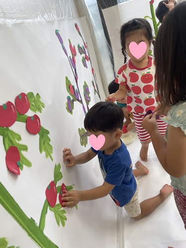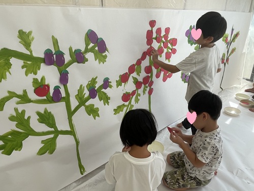 まずトマトやナスの絵を壁に貼ると、子どもたちのワクワクがぐんと膨らみました。