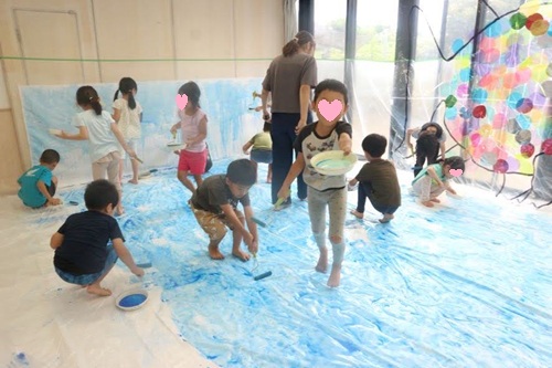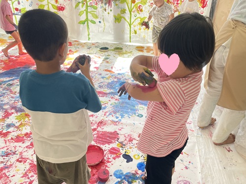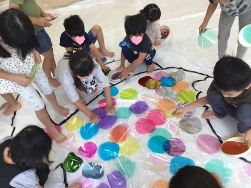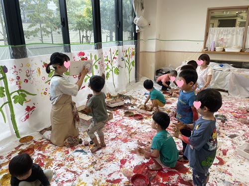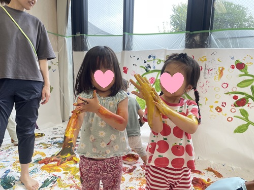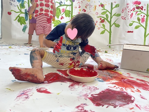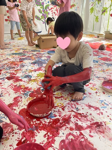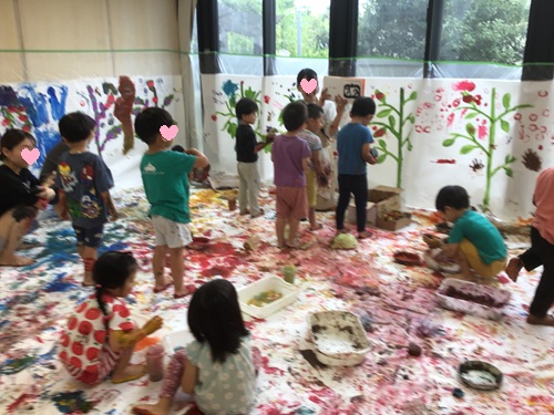 どのクラスも、絵の具のほかに片栗粉や寒天など、さまざまな素材を使ってたっぷりと表現遊びを楽しみました。