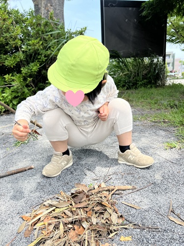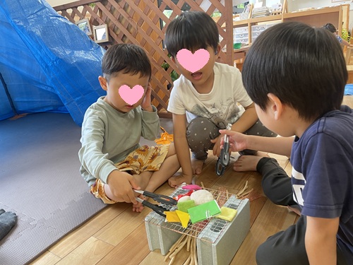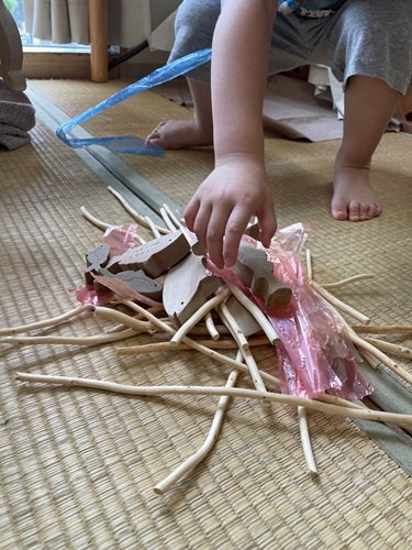 「焚き火がないと焼けないよ」と枝やスズランテープで焚き火を作ったりします。