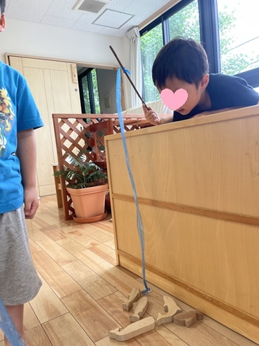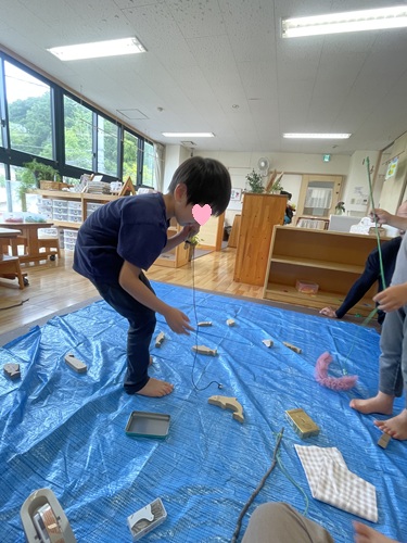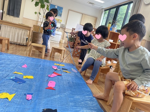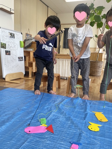 ブルーシートを広げると「海みたい!」という声があがり、釣り遊びが始まります。