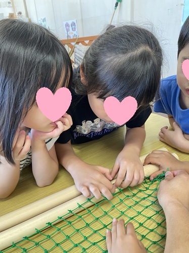 虫捕り網を作った経験から、さらにハンモック作りへとつながります。