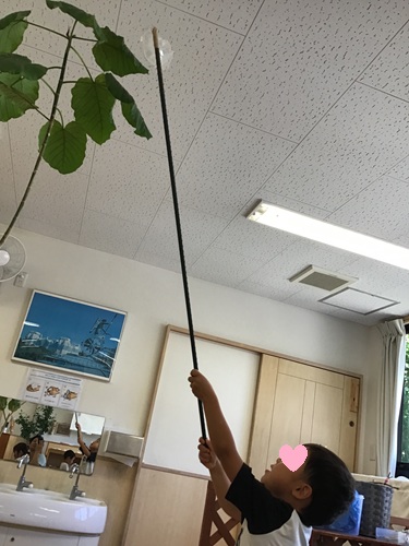 と考え、園にある素材を使って虫取り網を作ることにしました。