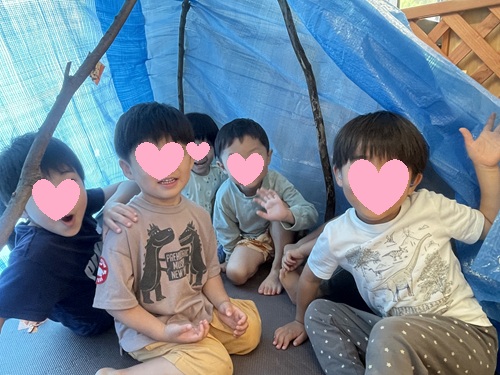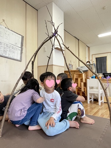 作ったテントを保育室に置いておくと、次の日も、その次の日も、子どもたちはテントを囲んでキャンプごっこで遊びます。