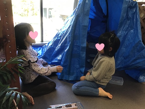 拾った枝を組み合わせてテントを作ると、