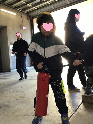 などを教えていただき、さらに消火器の使い方まで実際に体験させてもらいました。