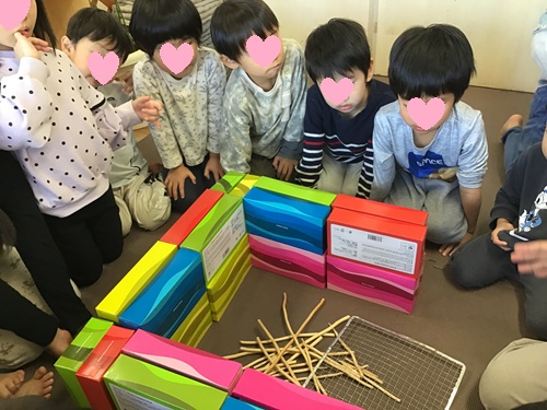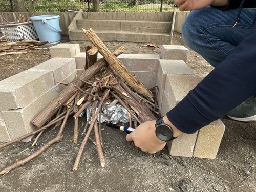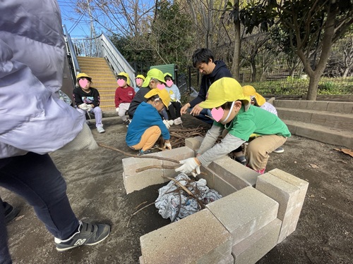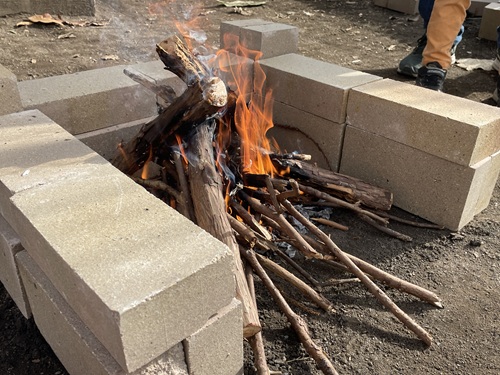 レンガを並べ、中に枝や新聞紙を入れ、火がつく瞬間をドキドキしながら見守ります。