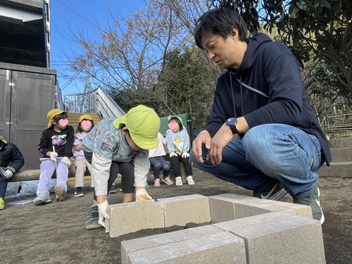 園に戻ると、子どもたちはさっそく焚火に必要なレンガの大きさを考え、