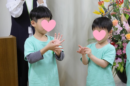 その後は、進級して年長組になったばかりの5歳児さんたちが、少し緊張しながらもみんなの前で手遊びを披露してくれました。